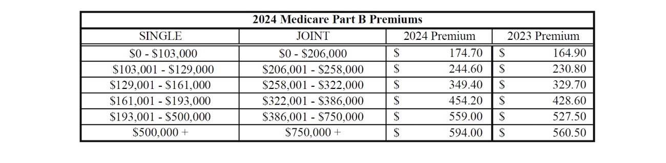 Medicare Part B premiums are based upon someone(s) Modified Adjusted Gross Income or their income before deductions. As you can see in the chart below, premiums can increase significantly at higher income levels: